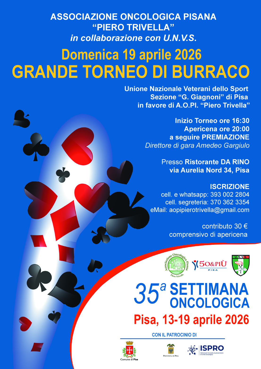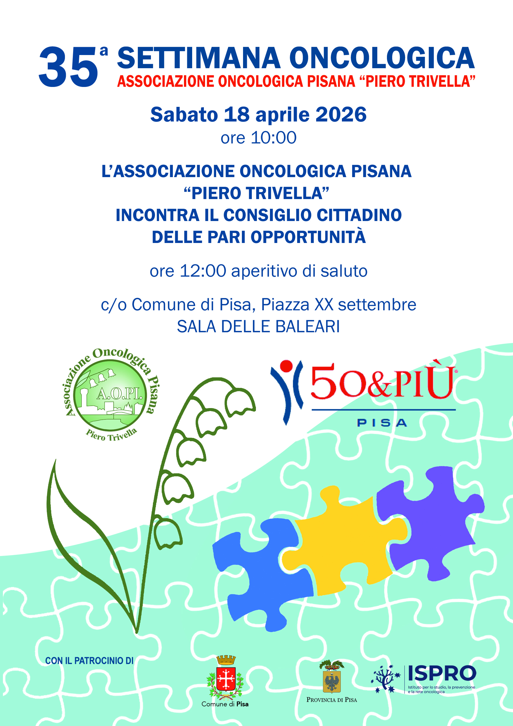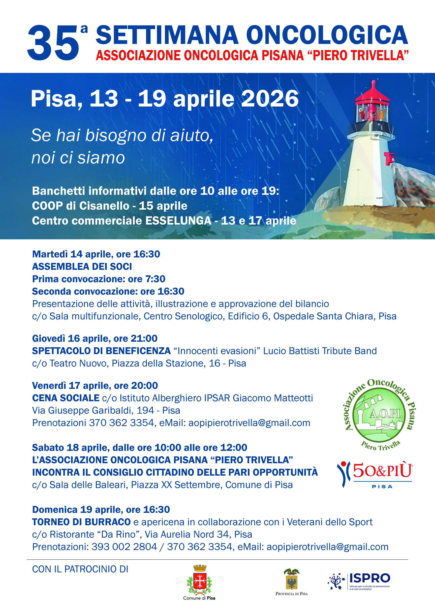 Il 20 aprile 2024 si è conclusa con la Cena Sociale la 33a Settimana Oncologica. La Settimana Oncologica è un evento annuale organizzato dall'Associazione Oncologica Pisana "Piero Trivella" per presentare alla città le proprie attività di sostegno ai pazienti oncologici e ai loro familiari, per far conoscere progetti in corso e futuri, per proporre iniziative di informazione e socialità.